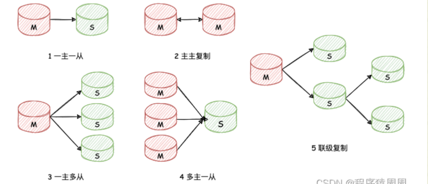 (1) 一主多从:一台主库服务器,多台从库服务器。读取数据时通过负载均衡分配到多个从库上读取,更新数据时写入主库,并同步更新到多个从库中。由于同步操作需要额外的时间开销,因此适合对实时性要求不高的场景。