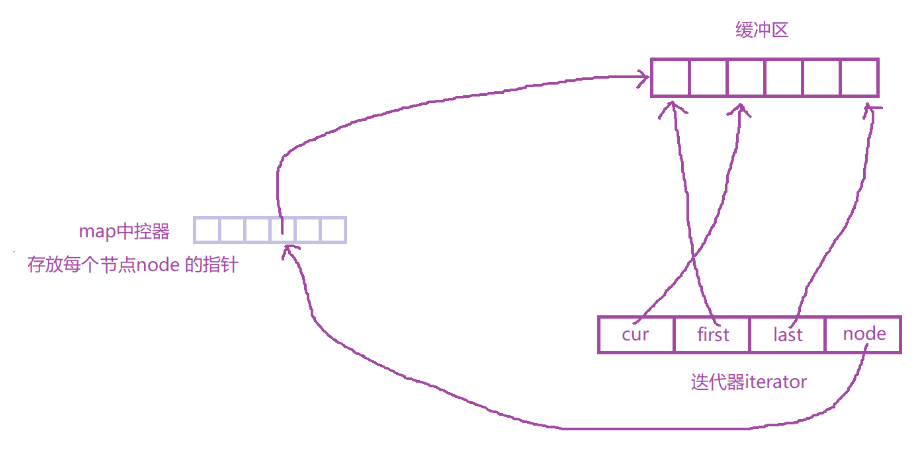 ④ 双端队列底层是一段假象的连续空间,实际是分段连续的,为了维护其“整体连续”以及随机访问的假象,deque的迭代器设计就比较复杂。由cur、first、last指向当前遍历buffer数组,node指向map中的元素,遍历deque的操作由这几个指针进行维护。